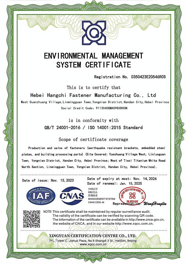 Хебеи Хангцхи Фастенер Мануфацтуринг Цо., Лтд., основана 2017. године, је професионално предузеће које интегрише производњу, истраживање и развој и продају затварача. Смештена у граду Ионгниан, провинција Хебеи, позната као "престоница причвршћивача у Кини", компанија се налази у највећој бази за производњу затварача у северној Кини. Имамо фабрику од 10.000 квадратних метара и 120 запослених, укључујући више од 50 професора и вишег техничког особља.